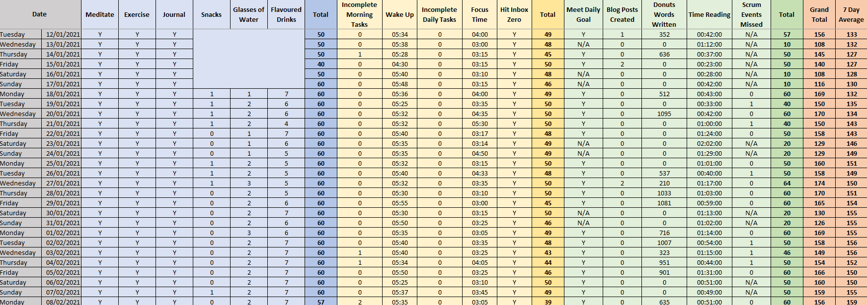 My spreadsheet gives me a daily score, however most beneficial I believe will be the weekly rolling averages. I don’t have to write a blog post every day, however I aim to write at least three a week. I don’t have to listen to my audiobooks every morning but I do want to make sure I’m listening for an appropriate time each week to hit my quarterly targets.